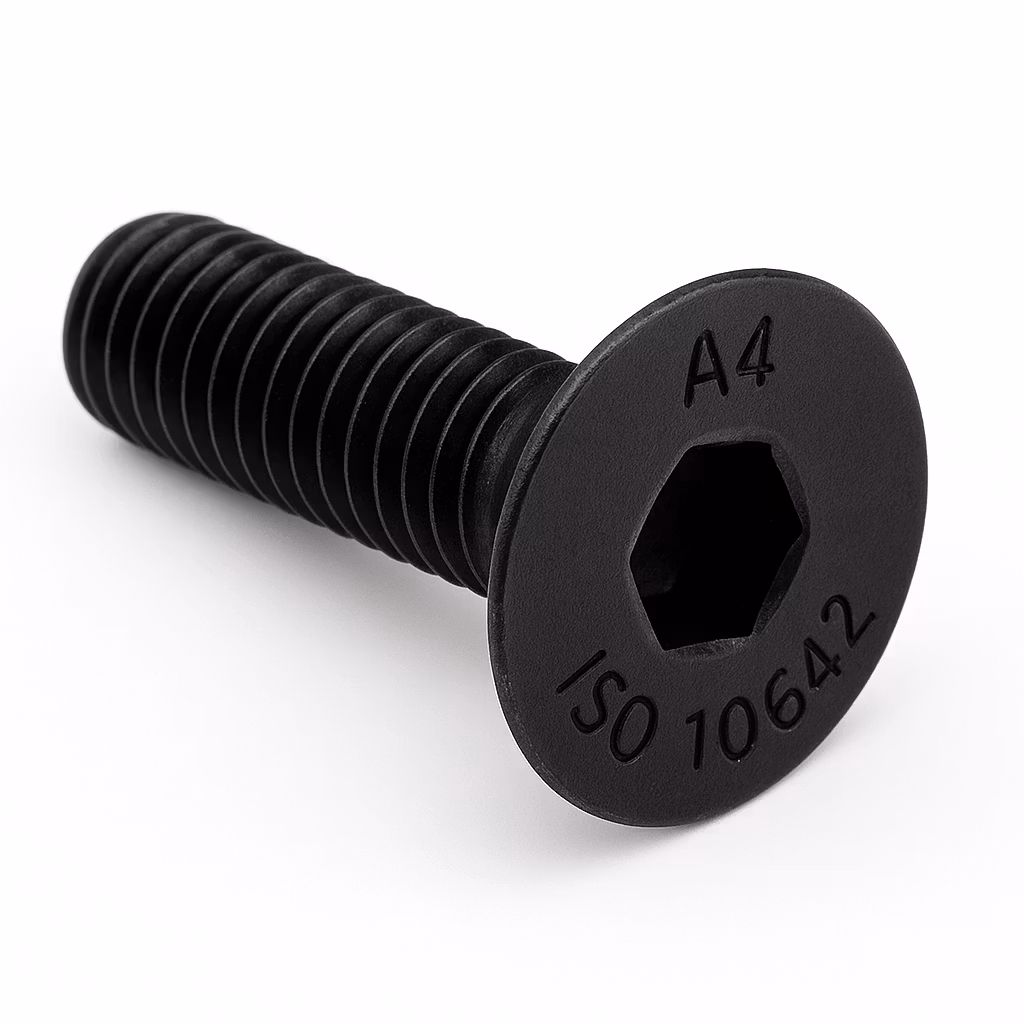 ISO 10642 ersätter DIN 7991. A4 syrafast + svartoxid ger en robust, matt svart yta för snygga, planförsänkta montage (90°).